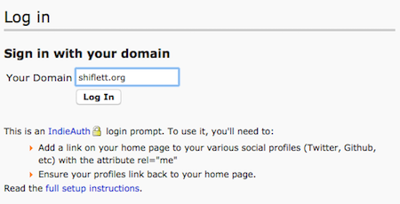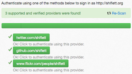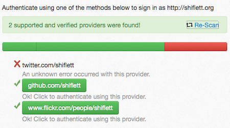 These links provide some assurance that the owner of shiflett.org is the same person as @shiflett on Twitter, etc. With this in place, I eagerly clicked log in with your domain to see what would happen.